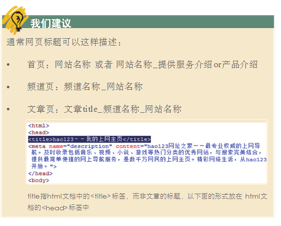 讓用戶第一眼就知道你的站點是干什么的,內(nèi)容是與哪些關(guān)鍵詞相關(guān)的,是不是他要找的內(nèi)容。百度白皮書大家看了沒有,里面有詳細(xì)的站點描述介紹,百度建議。