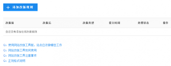 去百度站長工具提交改版規則,最主要的就是URL規則,新舊URL一定要對應上,不然百度判斷起來就非常費勁,那么審核時間可能就無限拉長。
