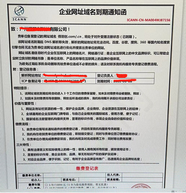 假冒某某域名注冊機構或冒充受原域名服務商委托,向企業傳真域名續費通知單,以域名到期不續費將被刪除,幫企業域名續費為名騙取費用,而實際上是否真正為企業續費可想而知。