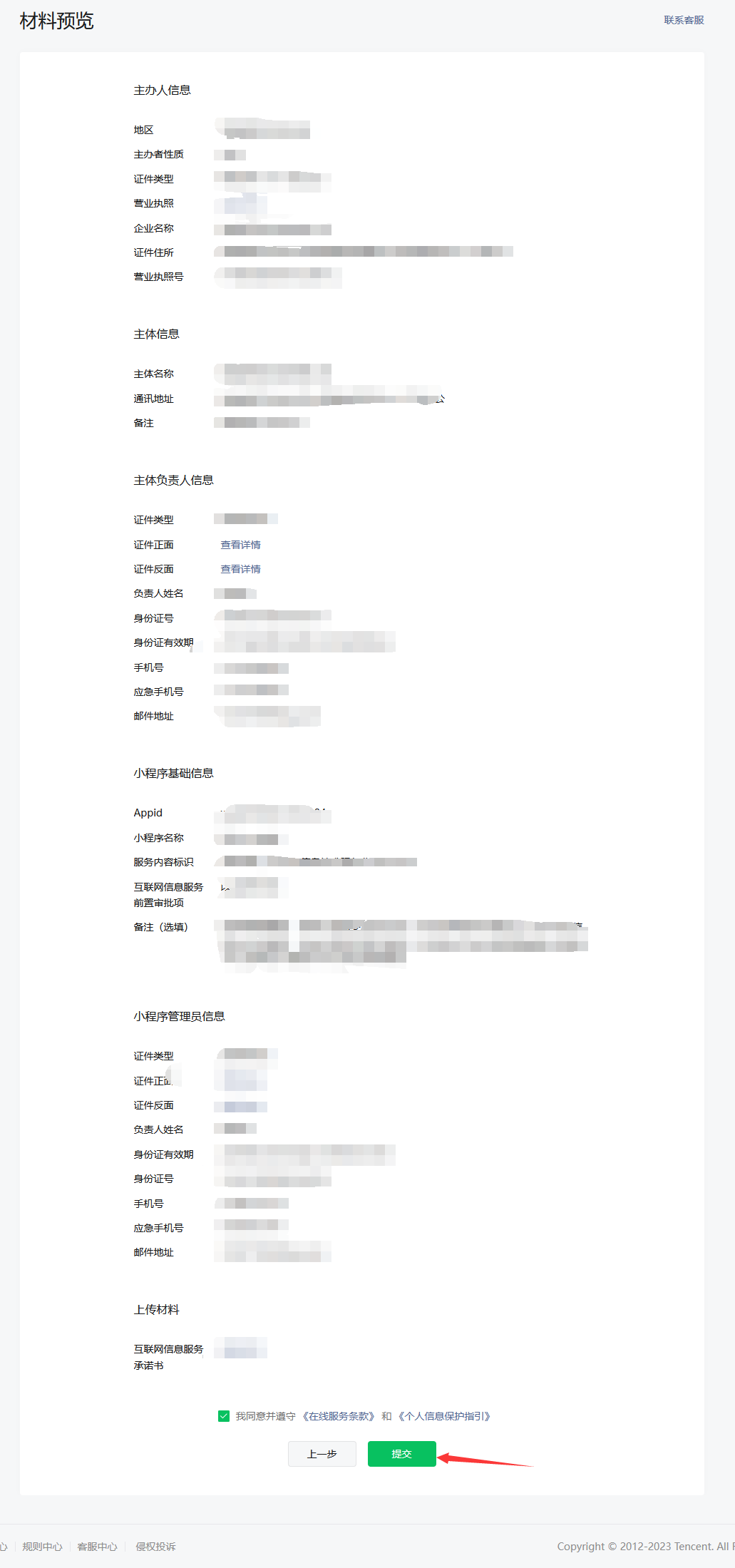 備案信息填寫:登錄小程序填寫備案信息,并上傳材料。其中包括主體信息填寫、主體負責人信息填寫、小程序信息填寫以及小程序負責人信息填寫及人臉核驗。