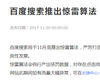 今天凌晨,百度搜索資源平臺發布了一則《百度搜索推出驚雷算法 嚴厲打擊刷點擊作弊行為》的公告,公告稱百度搜索將于11月底推出驚雷算法,嚴厲打擊通過刷點擊,提升網站搜索排序的作弊行為;以此保證搜索用戶體驗,促進搜索內容生態的良性發展。 很多為了快速提高排名,憑借互點、刷點擊等惡意競爭的方式提升網站排名,計劃三...
