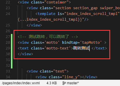【微信小程序內部跳轉配置的步驟:】 01. 如在page目錄下新建test目錄,包括test.wxml,test.js, test.wxss 001. test.js中必須配置,如下 Page( {} ) 002. test.wxml隨意寫入以下標簽,如下: 跳...