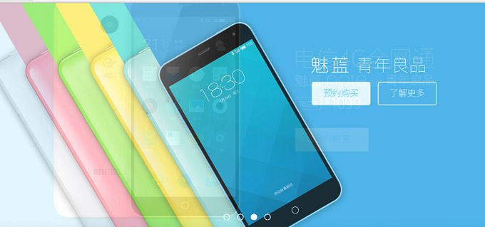 第二,網站的大圖應該具備統一的風格。把大圖作為網站的一種宣傳形象,那么在大圖的設計上就應該樹立一定的品牌形象,簡單說就是圖片應該有一定的規范。例如,我們可以把這些大圖設計成統一風格的、具有同樣色調或者模板的圖片。如下圖是魅族魅藍手機的大圖,從色調上我們很容易發現,這些提供宣傳的圖片在色調上都和手機名一樣接近藍色色調,通過這樣的風格的圖片,用戶就會對網站有一定印象,一看到廣告圖片就會比較容易想起這款手機的名字。