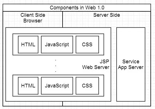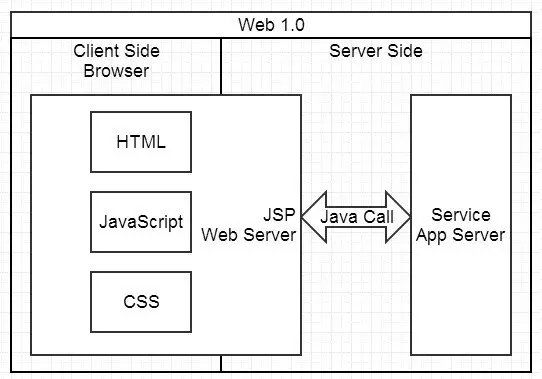 可稱之為 Web 1.0 時代,非常適合創業型小項目,不分前后端,經常 3-5 人搞定所有開發。頁面由 JSP、PHP 等工程師在服務端生成,瀏覽器負責展現。基本上是服務端給什么瀏覽器就展現什么,展現的控制在 Web Server 層。