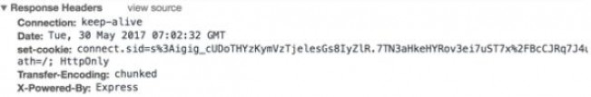 如上圖, 通過 Response Header 的 set-cookie 帶上,這樣截圖使用的是基于 Express 的 NodeJS 服務(wù)端框架, 這里面的 connect.sid=xxx 就是服務(wù)端給這個(gè)用戶生成的 Session ID。