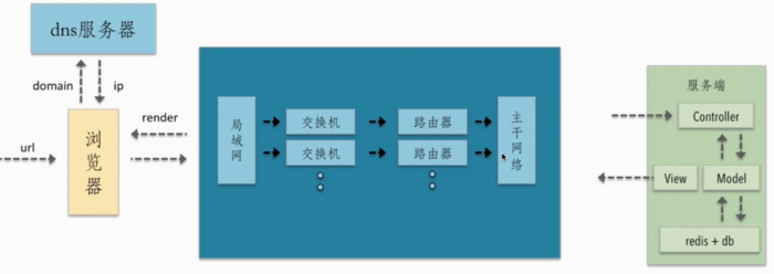 簡而言之,首先瀏覽器發送過來的請求先經過控制器,控制器進行邏輯處理和請求分發,接著會調用模型。這一階段模型會獲取redis db以及MySQL的數據,獲取數據后將渲染好的頁面,通過視圖返回給瀏覽器,最后瀏覽器通過渲染引擎將網頁呈現在用戶面前。因此,下一步就來到瀏覽器處理階段