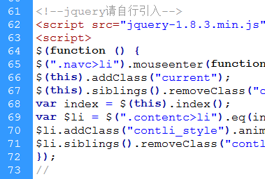 $(function () { A:當點擊[移動端]/鼠標移入上部菜單選項卡時,設置內容列表區域 1.監聽選項卡的移入事件 $(".navc>li").mouseenter(function () { 1.1修改被移入選項卡 $(this).addClass("curren...