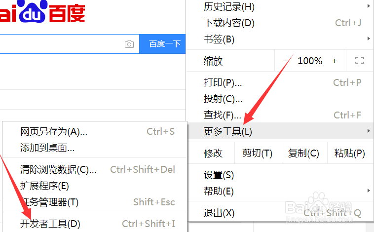 02. 在彈出的菜單中,我們點擊“更多工具”——“開發(fā)者工具”或直接F12。如圖