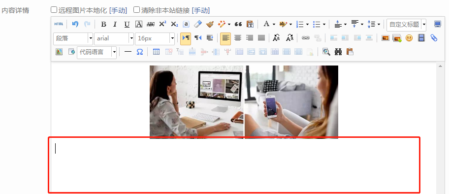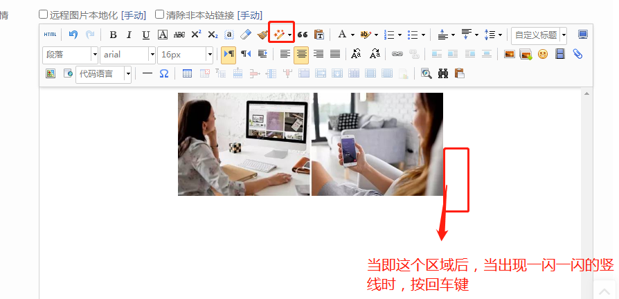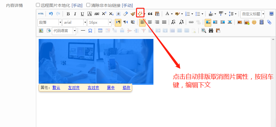 在使用百度編輯器時,上傳完圖片后,如果點(diǎn)擊圖片會出現(xiàn)圖片屬性,導(dǎo)致不能再編輯下文或其他區(qū)域,如何解決這個問題,其實方法很簡單,點(diǎn)擊編輯器面板上的 自動排版 按鈕就會失去圖片屬性焦點(diǎn),然后按回車鍵,可編輯下文。方法如下: