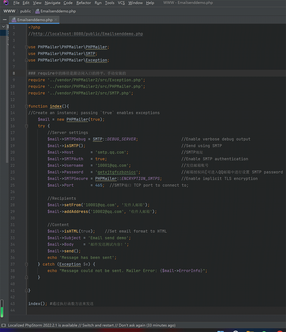 本文采用的方法是手動(dòng)安裝,注意require請(qǐng)求的路徑要必須正確,本文測(cè)試的文件是Emailsenddemo.php,在public目錄下,PHPMailer2文件是在vender目錄下,發(fā)送和接收的郵件地址都是采用個(gè)人QQ郵箱測(cè)試的,授權(quán)碼需要登錄QQ郵箱生成,可參考下面配圖中的demo進(jìn)行創(chuàng)建設(shè)置,才能正常發(fā)送。