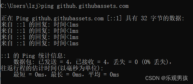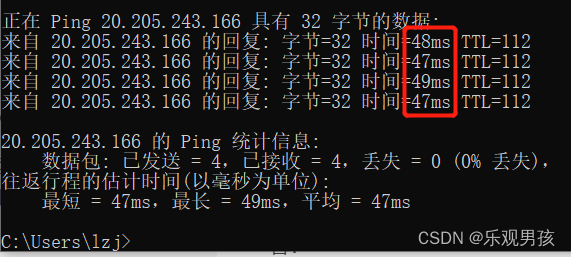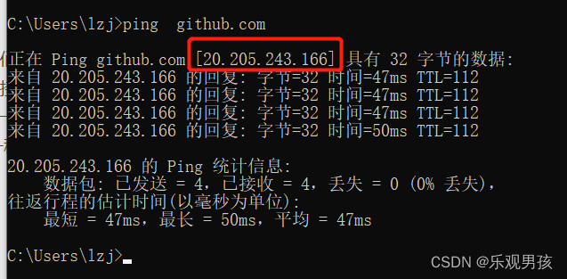 通過上面的步驟,我們通過域名找到了ip,避免了通過遠程dns轉ip的過程 。那么訪問這個ip快不快我們又怎么驗證呢?我們可以測試一下。比如我們測試一下githu.com域名對應的ip:20.205.243.166。在cmd ping一下這個ip: