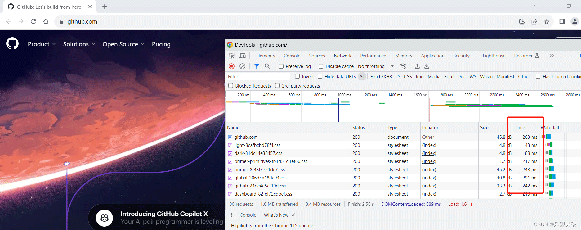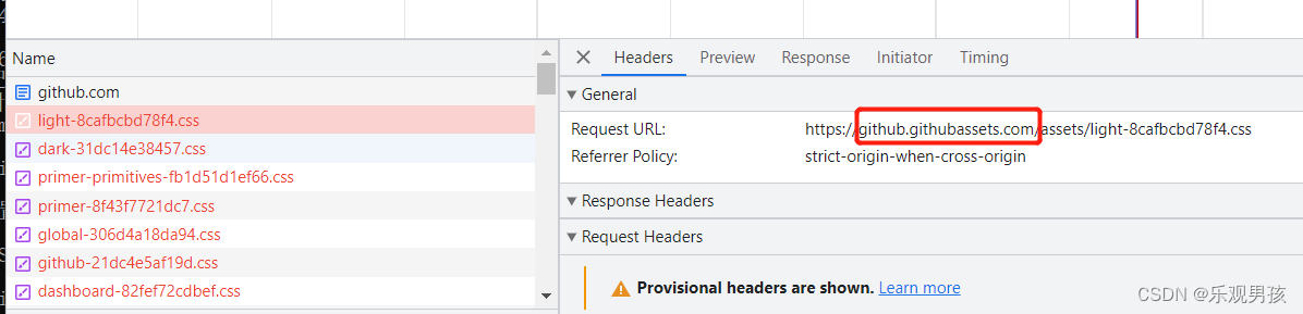 但是很奇怪,現在雖然訪問到了github,但是頁面布局錯亂,完全沒法看。從上圖的瀏覽器網絡請求上看,發現很多css樣式文件都加載失敗,所以網頁布局錯亂,應該就是css資源加載失敗導致的。查看下請求css資源的地址,發現它的域名與github的域名不一樣,猜測也是根據域名轉ip影響的: