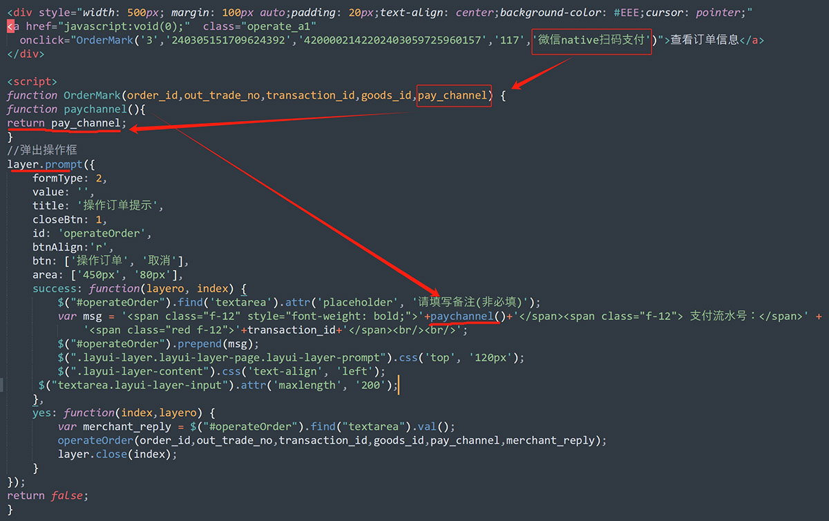 示例:HTML DOM中的a標簽有個onclick屬性,該屬性有個OrderMark()函數,該方法中接收到4個實參,注意的是OrderMark()函數中包含著layer.prompt彈出框的方法。當用戶點擊a標簽時,會觸發這個OrderMark函數。假如在layer.prompt彈出框中不能直接使用外面的第4個參數,這時需要新建了一個函數paychannel()來返回第4個參數,在layer.prompt中運行paychannel()就能間接使用該參數了。